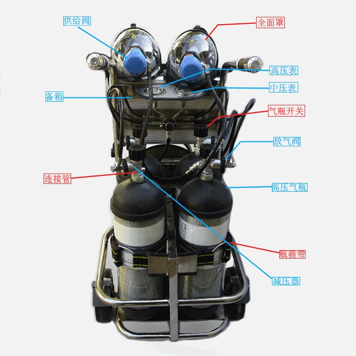 2.移動氣源通過腰間閥和逃生氣瓶組合,正常情況下會直接使用移動氣源的空氣。如果發(fā)生突發(fā)狀況,需要工作人員立馬撤離現(xiàn)場并打開逃生氣閥,向安全區(qū)域撤離!